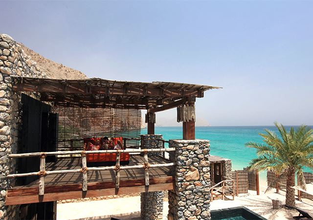 Hors du temps, dans une baie enclavée par la montagne, par derrière, et la marina au-devant, au nord de la péninsule de Musandam : The Six Senses Zighy Bay.